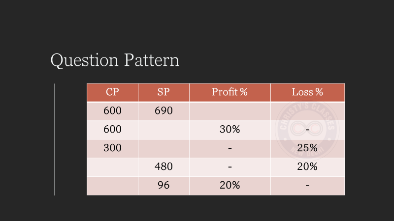 Each row in the table above represents a type of question to expect. At least one data is missing and is left for the aspirant to find.